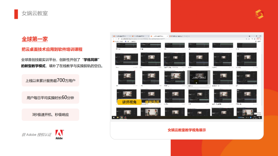 女娲云教室于2020年上线,是十方融海自主研发的“学练同屏”技能实训平台。该平台通过云端技术重构实训模式,学员无需在本地安装PR、AE等专业软件,打开浏览器即可进入实操学习环境,降低了数字技能学习的技术门槛。
